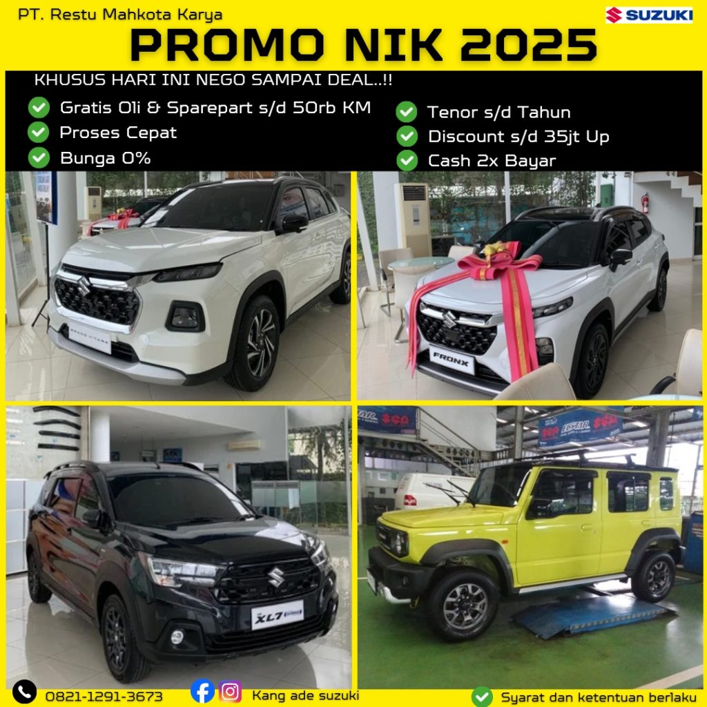 Dapatkan penawaran diskon terbaik di bulan januari dengan nik 2025, promo cuci gudang, dengan banyak bonus pilihan, dan discount sd 30jt up, segera konsultasikan rencana pembelian Suzuki anda pada sales andalan kami,